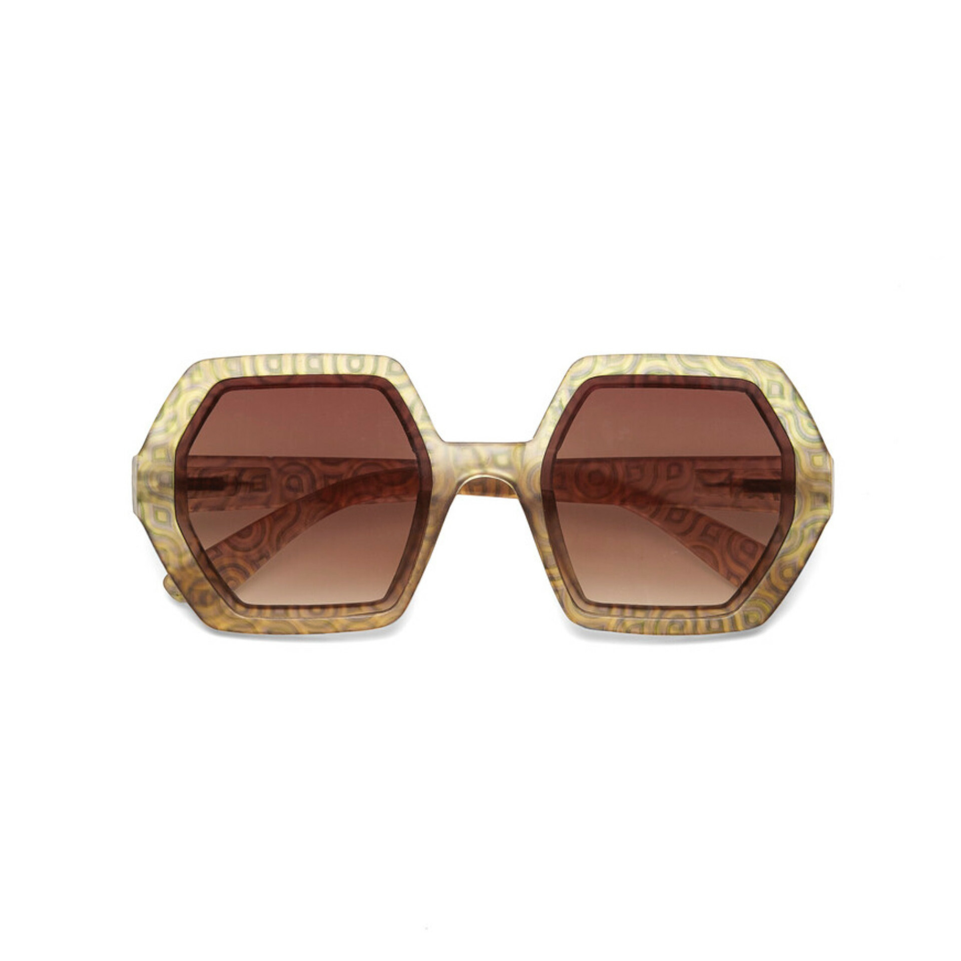 EMMA is a pre-assembled hexagonal sunglasses with soft touch frame and overlapping lenses.